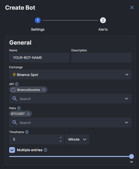 Vous gagnerez également à donner un nom spécifique à votre bot que vous pourrez clairement identifier (Par exemple : « BTC/USDT – LONG – 5M – MACD »)