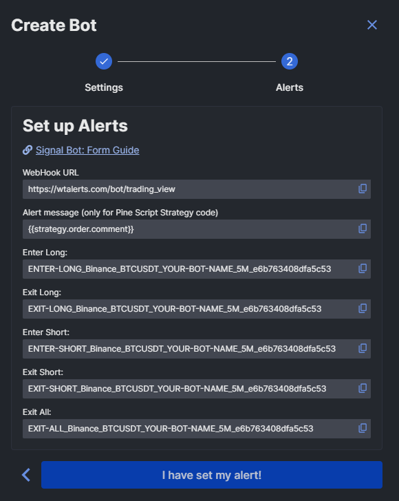 - Toujours dans WunderTrading, créez un « bot de signal ». Notez les message d’entrées et de sortie de position qui vous seront donnés lors de la création.