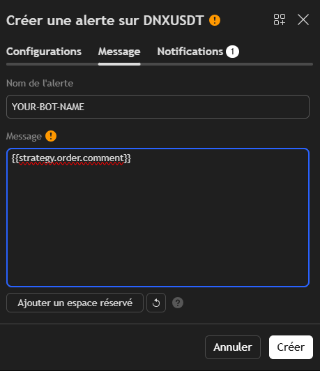 4 - Sur TradingView, entrez les messages des bots dans la fenêtre de configuration