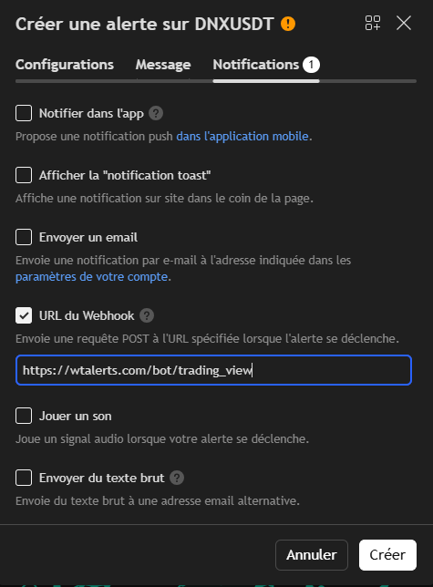 - Créez une alerte une fois votre stratégie réglée et les messages entrés dans les paramètres. Configurez votre alerte pour qu’elle envoie un webhook à l’adresse qui vous sera donnée lors de la création de votre bot et dans la section « Message » de l’alerte, entrez le message qui vous sera donné lors de la création de votre bot.