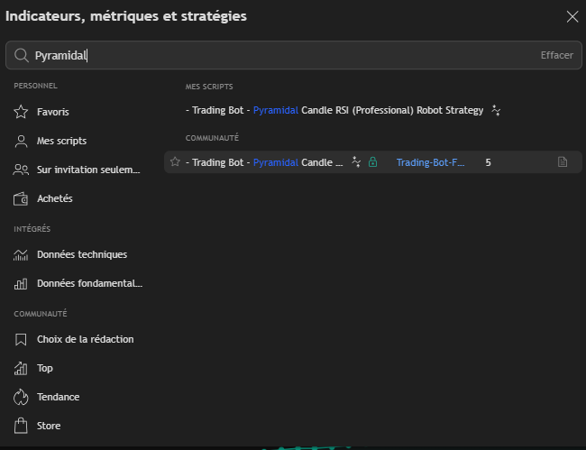 - Pour charger la stratégie sur TradingView : Cliquer sur indicateurs puis recherchez – Trading Bot – Pyramidal Candle RSI – Robot Strategy –