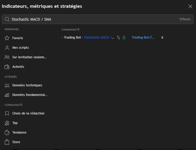 - Pour charger la stratégie sur TradingView : Cliquer sur indicateurs puis recherchez – Trading Bot – Stochastic MACD / SMA – Robot Strategy –