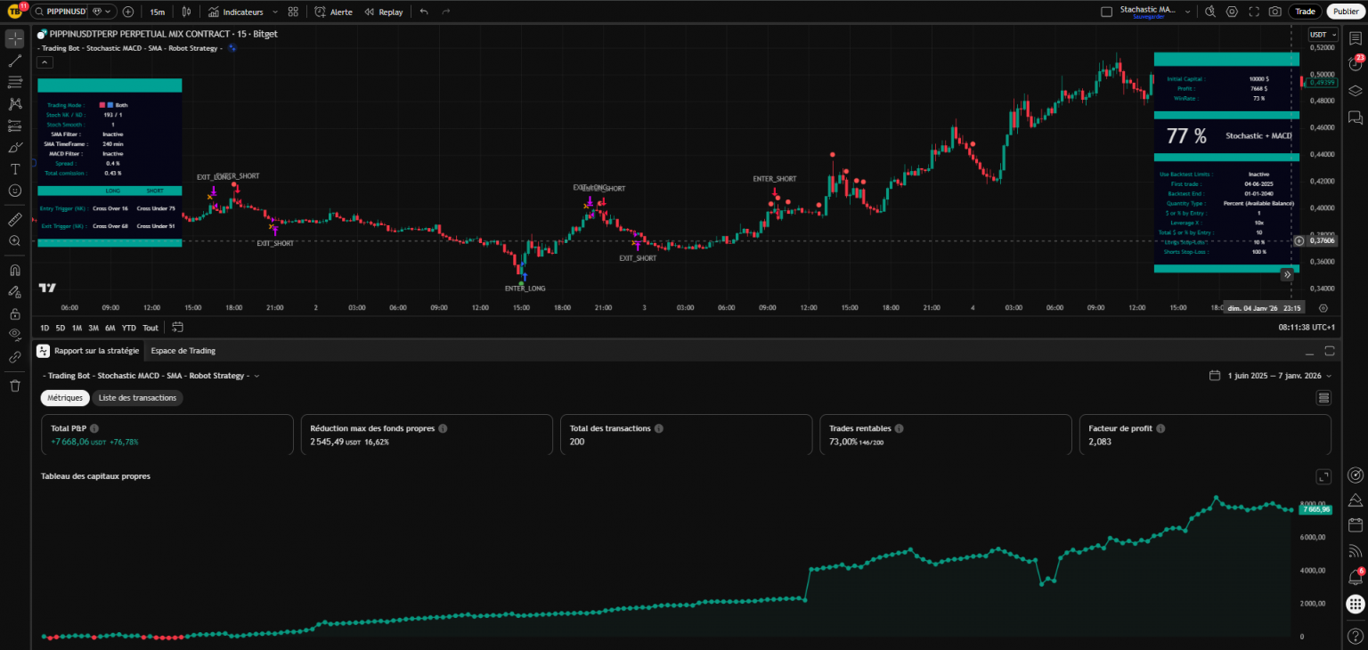 - Cette stratégie dispose de backtests automatique. Les backtests doivent être manuellement affinés sur TradingView avant d’êtres validés.