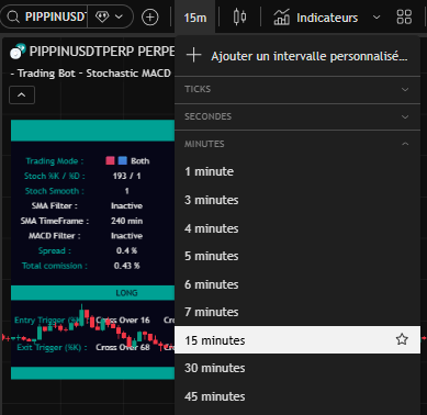 Sur TradingView, commencez par sélectionner une TimeFrame 15m recommandé pour cette stratégie). La stratégie fonctionne sur la majorité d’entre elles même si bien sûr les réglages seront à adapter. Vous pouvez commencer par reproduire les réglages proposés sur le canal Telegram et nous allons voir ensembles comment les affiner.