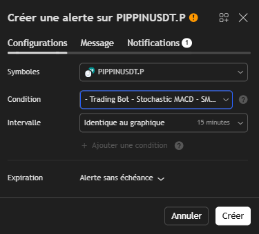 Une alerte enregistre tous les réglages, timeframe, actif, etc qui étaient à l’écran au moment de sa création. Une fois l’alerte crée, vous pouvez fermer la stratégie ou la régler différemment, cela n’aura plus d’impact sur votre bot qui continuera de tourner avec ses réglages d’origine en tâche de fond et passera les ordres d’achat et de vente le moment venu.